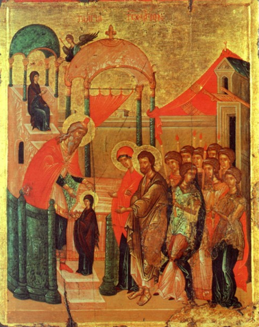 Aujourd’hui, nous célébrons la présentation au Temple de la très sainte Mère de Dieu. Les parents, Ioakim et Anne, ont amené leur fille, Marie, au Temple et l’ont consacrée à Dieu. Ce jour-là, Marie a traversé le porche, elle est passée dans le Saint, elle a monté les quinze marches d’escalier et elle est entrée dans le Saint des Saints, réservé seulement au grand-prêtre une fois par an. Tous ceux qui étaient présents dans le Temple étaient étonnés par l’audace de Marie, et les anges étaient remplis de joie. Cet événement n’est pas raconté dans l’Evangile : il appartient à la tradition et à la mémoire de l’Eglise. Ce n’est pas pour eux que Ioakim et Anne désiraient un enfant mais pour accomplir le dessein de Dieu. Par la naissance de Marie, ils voulaient s’associer au plan de Dieu et devenir ses coopérateurs.
