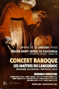 Le projet « Les maîtres du Languedoc » est construit autour de deux grands compositeurs occitans du 17ème siècle : Guillaume de Bouzignac et Etienne Moulinié. Ces deux compositeurs incarnent un répertoire baroque régional en pays d’Oc, qui rassemble des pièces sacrées et des pièces spirituelles, auxquelles se sont ajoutées des compositions de la fin du 16ème siècle.